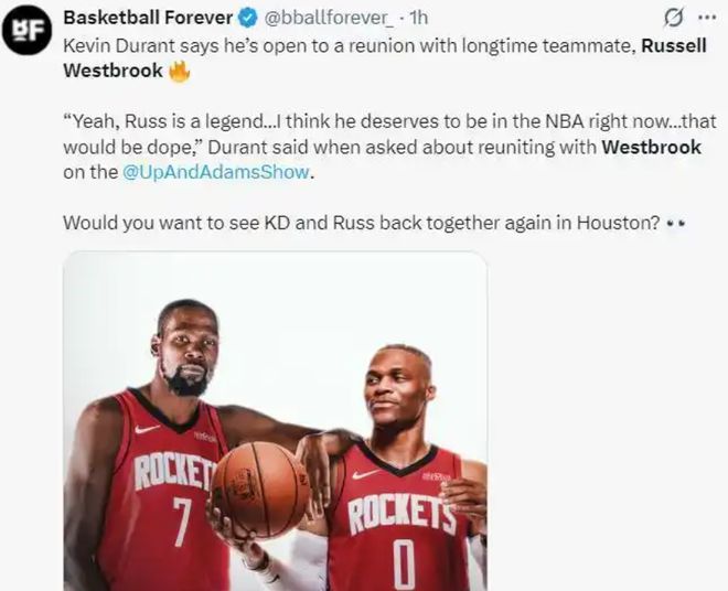 而就在近期,杜兰特在播客节目中也谈到了威少的情况:“拉塞尔(威少)是传奇,我认为他现在理应留在NBA,也该用自己想要的方式结束NBA生涯。”当被问及威少是否会加盟火箭时,杜兰特表示他完全不清楚,也没向任何人打听过,这件事根本没被提上议程。